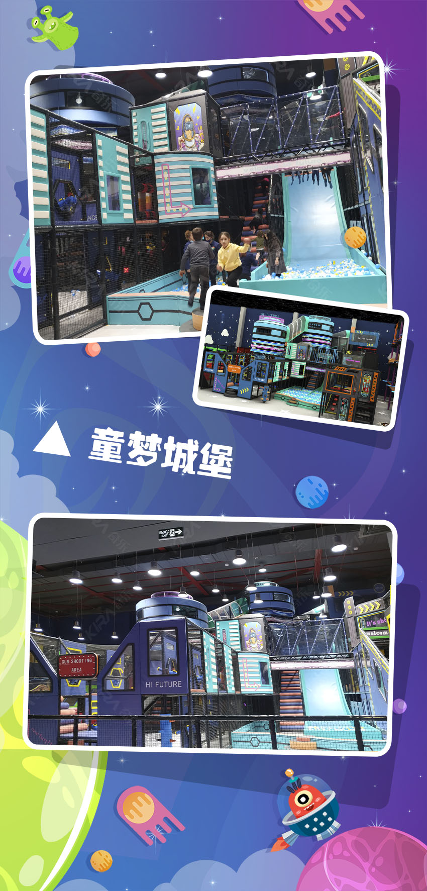 極富創意的未來科技風格,多元太空背景設計交相輝映。用想象力襯托藝術之美,令孩子們打開通往新世界的大門,編織屬于自己的童夢幻想。給時間以無盡色彩,讓生命充滿溫情追憶! 亞美尼亞親子運娛中心,新潮科幻風卡通元素,打造國際范太空主題樂園,用心為每個家庭創造甜蜜回憶!