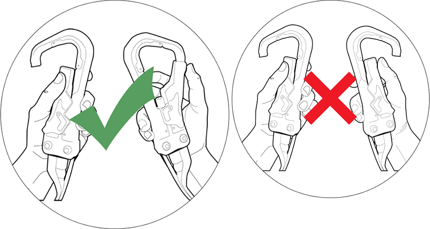 1、按下登山扣門打開解鎖的掛鉤,第二個登山扣保持鎖定狀態。