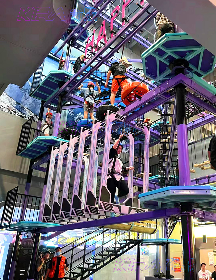 設(shè)計(jì)了高、中、低三層拓展步道,設(shè)置有懸空橋梁、鉆筒等步道關(guān)卡,游玩者需通過爬、鉆、滑、跳、跨等動(dòng)作來進(jìn)行探險(xiǎn),可以鍛煉游玩者的勇氣、毅力和身體的協(xié)調(diào)性。