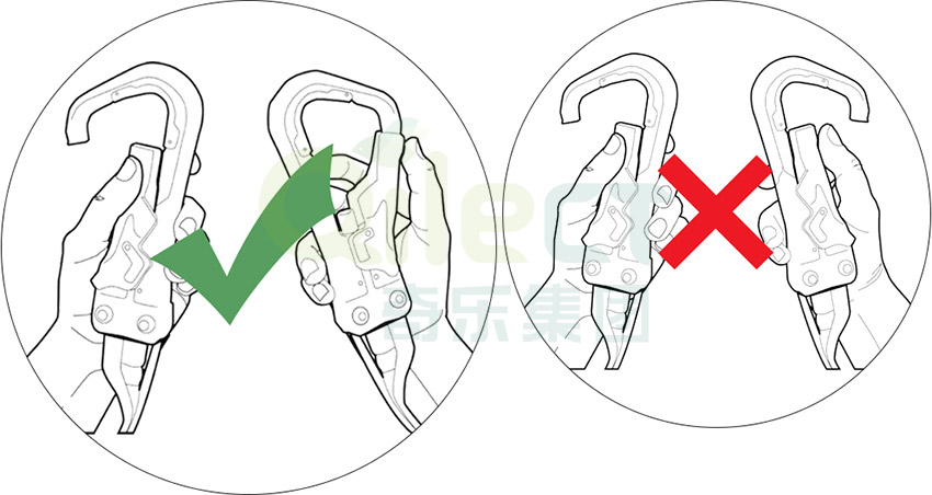 1、按下登山扣門打開解鎖的掛鉤,第二個登山扣保持鎖定狀態(tài)。