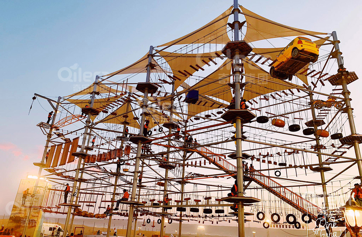 這種創新設計不僅賦予設施強烈的視覺辨識度,更通過動態動線規劃實現功能復合化,整合高空觀景臺、攀巖墻、滑索道、秋千矩陣等模塊,形成500-1000米的立體探險路線。