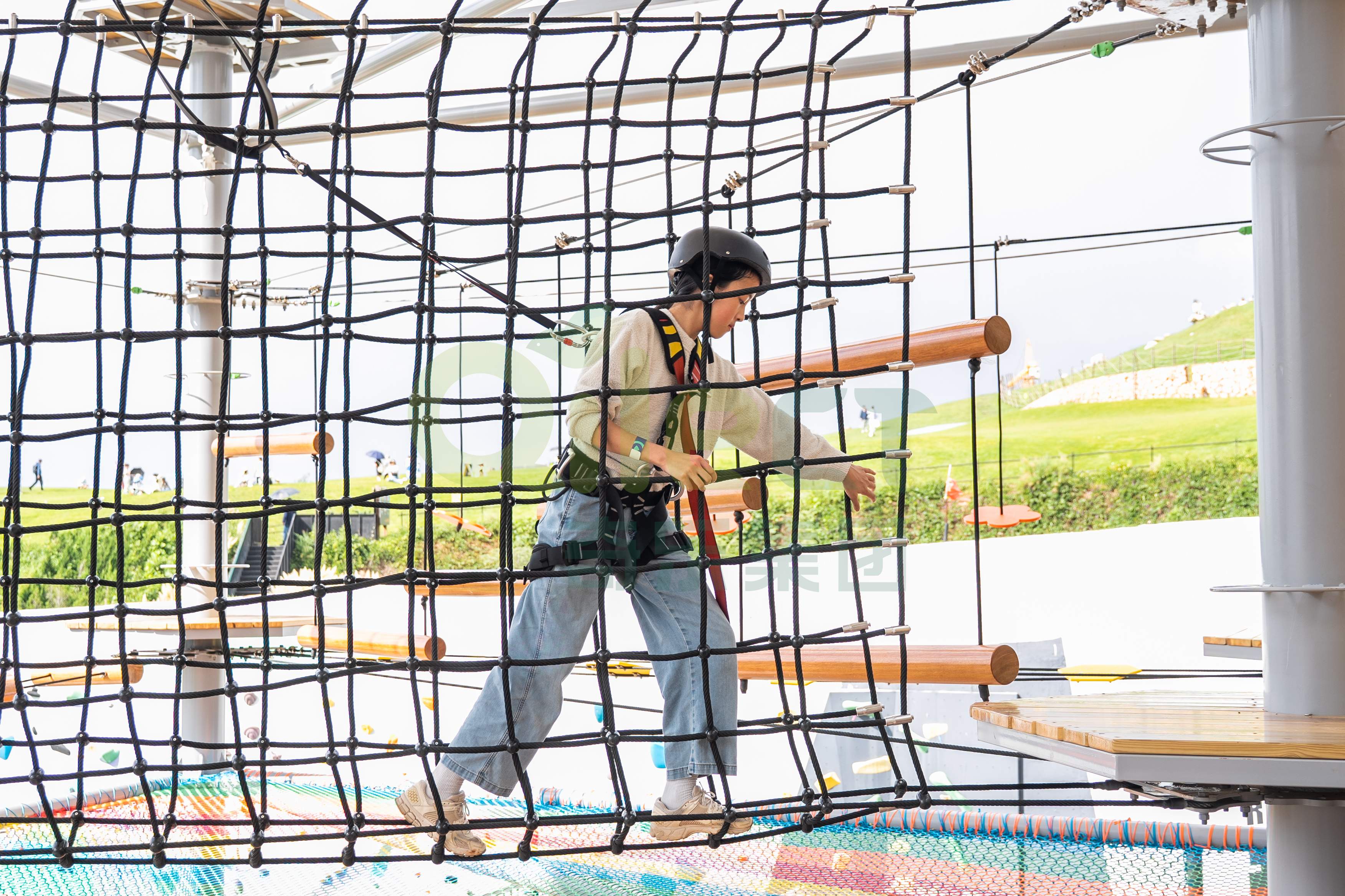 一座大型水晶塔的空中步道總長可達數百米,包含百余種趣味關卡,能夠同時容納上百名游客進行探險。更重要的是,通過科學的分層路線規劃,它能覆蓋從4歲兒童到成年人的全年齡段客群。孩子們可以在低齡區鍛煉勇氣,青少年和成人則可以挑戰更具難度的攀爬網、高空步道以及令人腎上腺素飆升的頂層速降項目。這種家庭全員可參與的特性,是其能引爆社交傳播和家庭出游市場的關鍵。