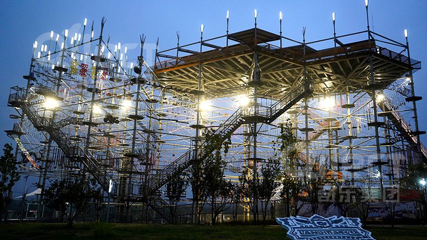 在北京溫榆河生態走廊的核心區域,一座由廣州奇樂游樂設備有限公司設計建造的「阿爾法戶外探險水晶塔」正以獨特的幾何美感重塑城市休閑版圖。這座總高度29.8米、占地1100平方米的立體探險設施,不僅是奇樂模塊化設計理念的集大成者,更通過軍工級安全體系與智能監測技術,為都市人群開辟了全新的戶外運動場景。