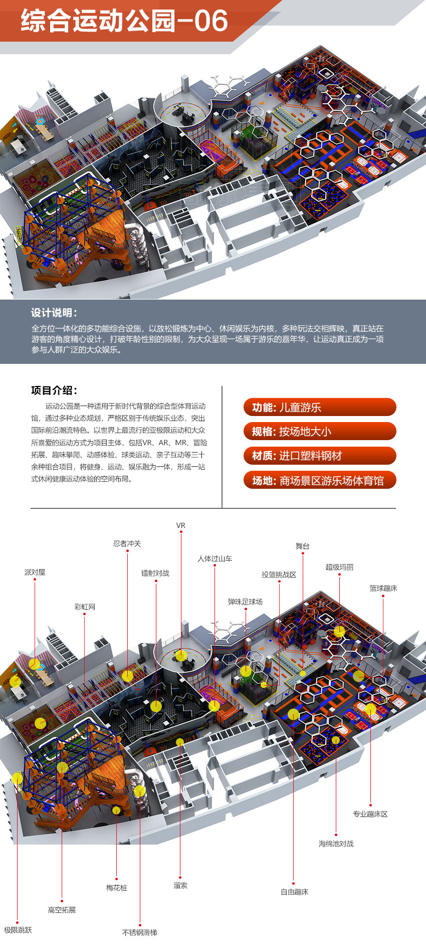 運動公園是一種適用于新時代背景的綜合型體育運動館,通過多種業態規劃,嚴格區別于傳統娛樂業態,突出國際前沿潮流特色。以世界上最流行的亞極限運動和大眾所喜愛的運動方式為項目主體,包括VR、AR、MR、冒險拓展、趣味攀爬、動感體驗、球類運動、親子互動等三十余種組合項目,將健身、運動、娛樂融為一體,形成一站式休閑健康運動體驗的空間布局。