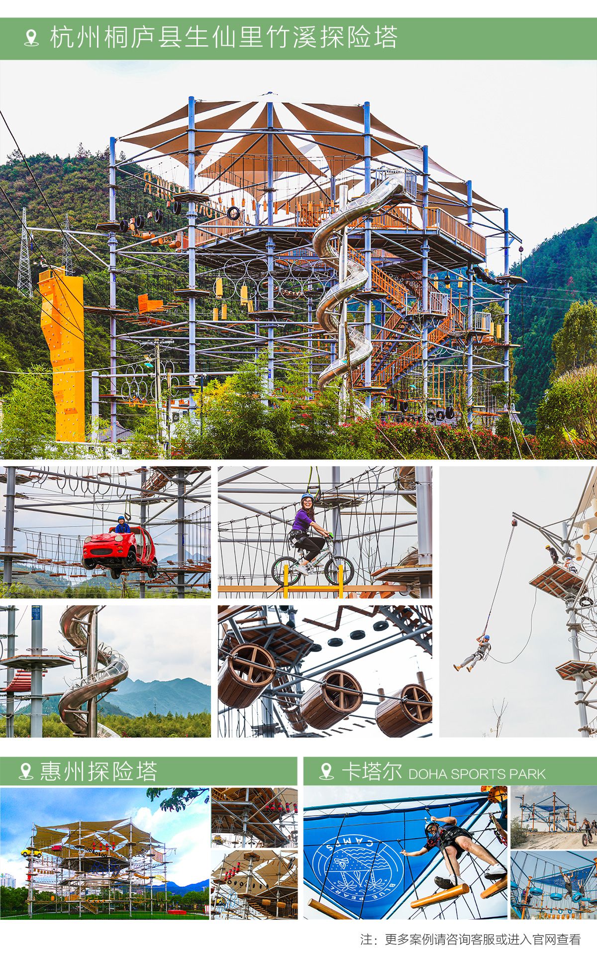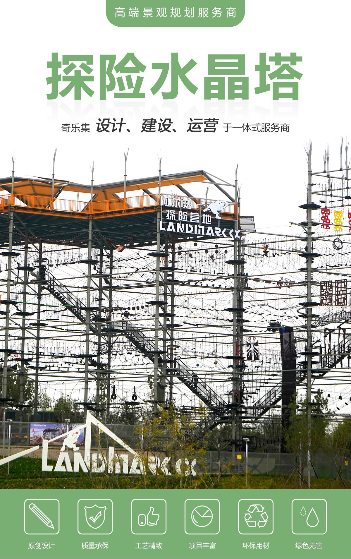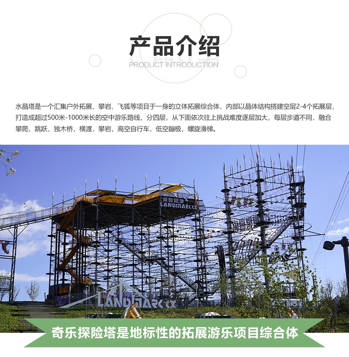 匯集 200 種游樂步道,適合廣大游客 水晶塔集冒險、運動、娛樂、挑戰于一體的綜合游樂類項目,通過在塔內設置并搭建各種難易不同、風格迴異、超強刺激的步道關卡,讓游客體驗高空墜落與自由滑翔的快感,感受塔內項目攀爬穿越的刺激。水晶塔是一個創新且極具盈利能力的全新休閑旅游項目,適合建在戶外,也可以建在窒內。 晶體結構,更穩固,更安全 水晶塔采用品體結構設計,每4根立柱為1個晶體結構,可根據客戶需求自由組合,晶體結構設計更大的增加設備的穩定性、利用率,保證客戶場地的實用率最大化,立柱之間做連桿支撐,根據結構設置觀景臺,可達 80~1000+m?,可作為餐飲,休閑吧,咖啡吧,酒吧等休閑休息區域,平臺下方懸空架連接桿支撐,平臺可同時承載 30-1000+人。 搭配我司自主研發生命系統,保障安全無死角自主研發自鎖式雙掛鉤,相互交替型安全保障永遠保證有一個掛鉤自鎖在鋼絲繩上面,保障安全無死角。
