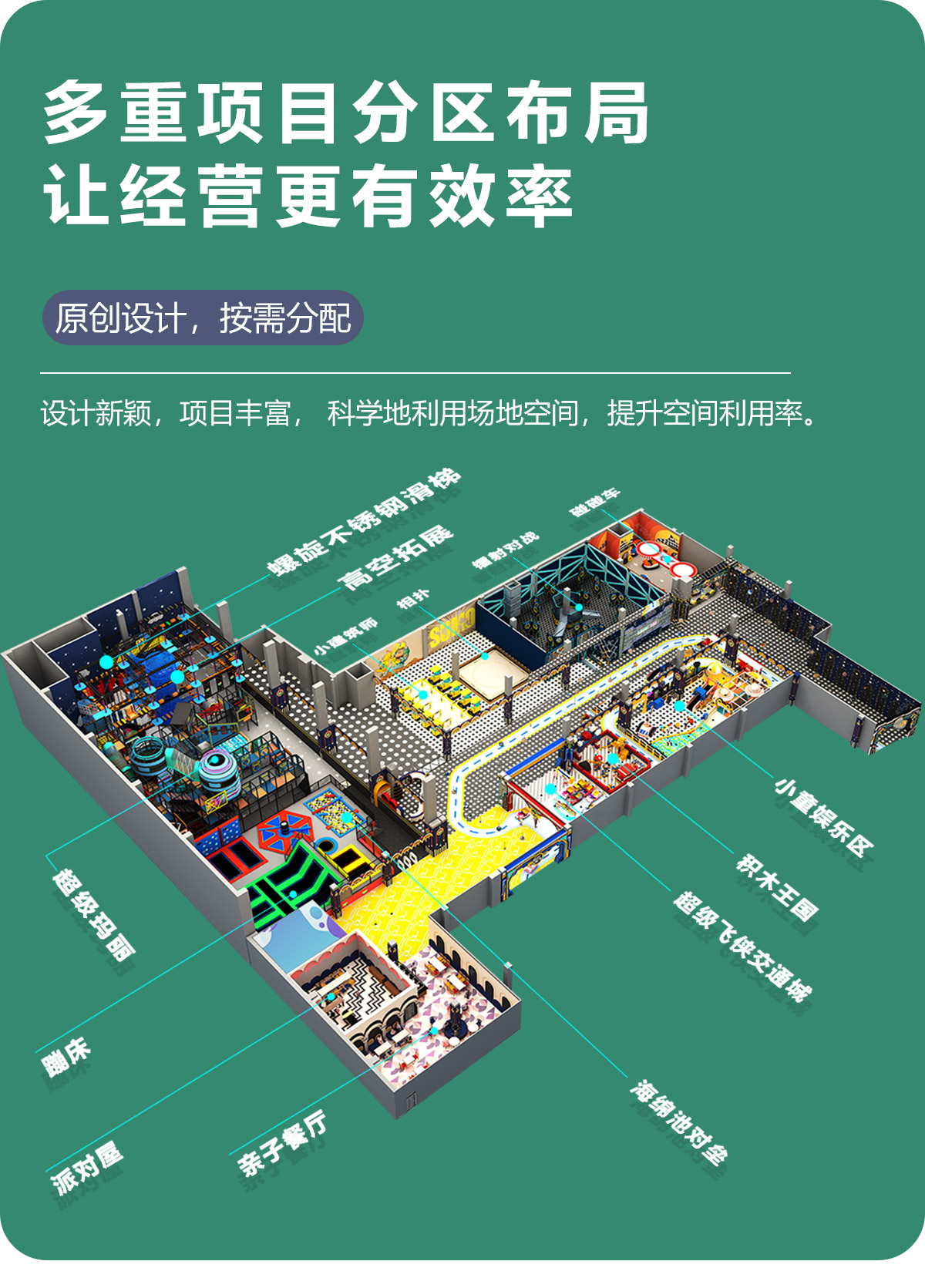 奇樂兒童樂園是包含淘氣堡、親子娛樂中心、彈跳迷宮、攀爬拓展、海洋球池等項目在內的一體化游樂設施。它有別于傳統的單一游樂設施,相比而言奇樂兒童樂園在項目上更加的豐富,在結構布局上更加的合理,在安全性穩定性上更有保障,在收益渠道上更加廣闊,是目前兒童樂園項目的主流。